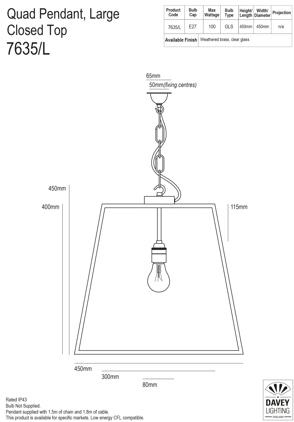 “Small, medium, large or extra large Quad Pendant in weathered brass. Suspended on a weathered brass hook and 1.5 meters of chain. Glass on four sides, with a closed top for exterior use.”