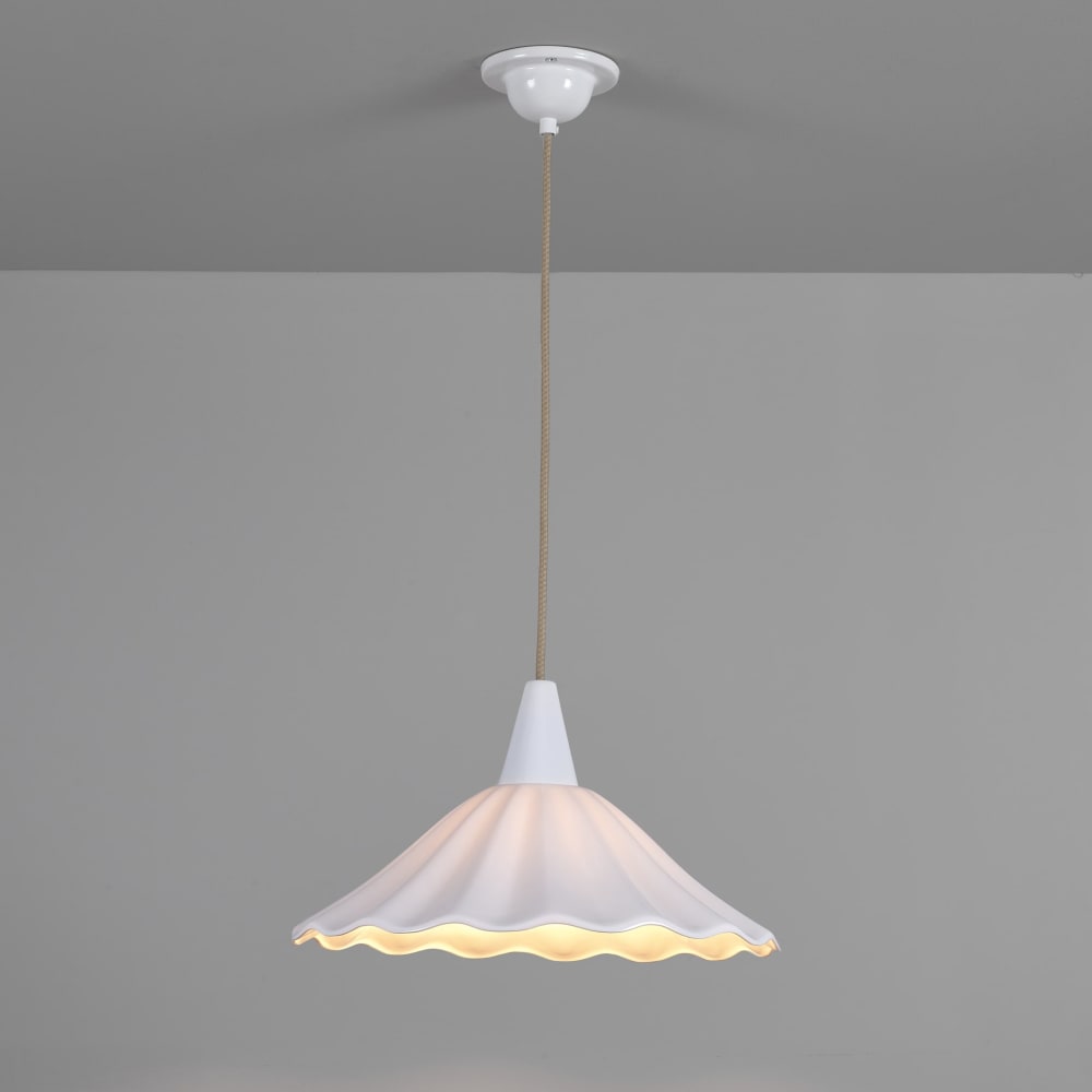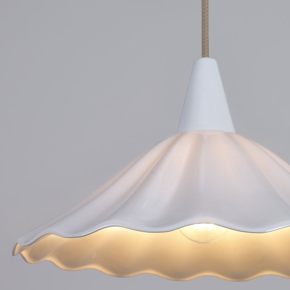 “An exquisitely hand crafted bone china light, with a shade that has been inspired by the rolling ocean waves. Bone china has been expertly moulded to create this eye catching Christie, available either as a rise & fall or pendant. Our trademark sand & taupe braided cable and bone china ceiling rose finish the design off beautifully.”