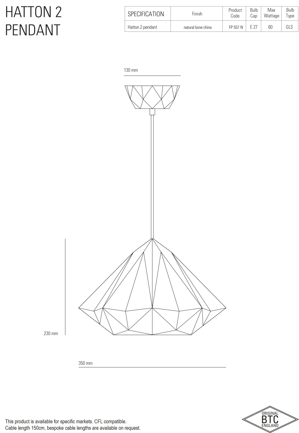 Hatton är en lampserie från Original BTC där skärmarna ser ut som vikt papper men är gjutna i vacker benporslin. Hatton kommer i en rad olika storlekar och former, antingen som enkla pendlar eller flera i grupp, med textilkabel och takrosett i porslin.