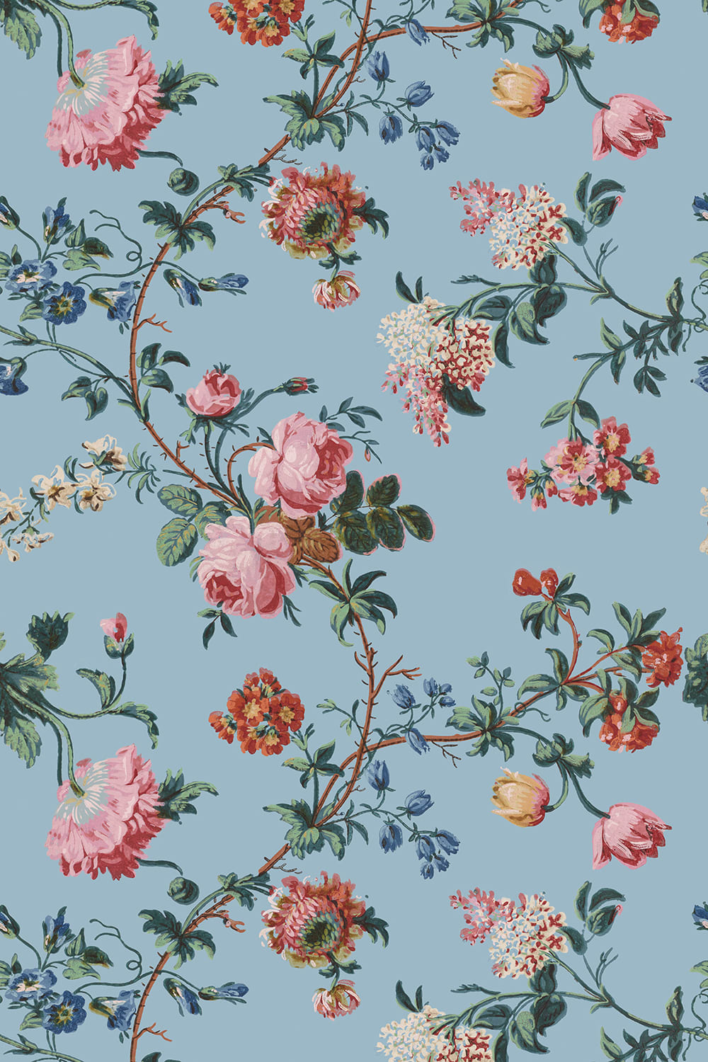 Tapeten Drosnay är ett nytryck på en fransk tapet från ca 1780-1800 i den stil som kallas Indienne efter de tyger med indiska mönster som trycktes i Frankrike på 1700-talet. Eventuellt blocktrycktes originaltapeten med samma utskurna block som användes för tygtryck. Vi har valt att behålla den lite ojämna och lätt patinerade känslan hos originalet. Tapeten finns dels i den mindre originalstorleken, dels i en version i dubbel storlek och trycks på beställning på helmatt nonwoven i rullar som är 50 cm breda och 10 m långa.