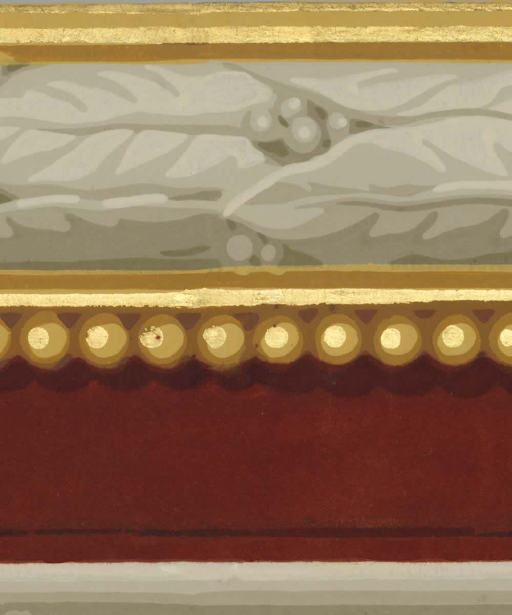 Bården Saint-Étienne är ett nytryck av en fransk bård från ca 1850. Ursprungligen var bården tryckt med guldfärg och flockad (sammet) men vår version är helmatt. Bården är 12 cm hög och säljs i rullar som är 10 meter långa. Som brukligt är med gamla bårder trycks de flera i bredd på en rulle och skärs sedan ut för hand. Kanterna på bården ska därför trimmas innan uppsättning. Trycks på beställning på helmatt nonwoven.