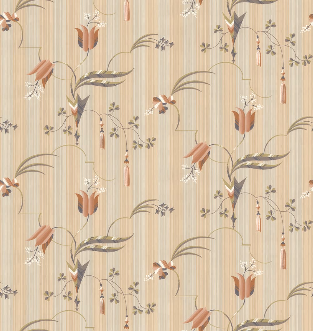 Dagobert är en reproduktion av ett tapetmönster tryckt på 1920-talet, hämtat från Tapetoramas arkiv. Flera detaljer i mönstret visar stora likheter med den österrikiske konstnären och formgivaren Dagobert Peches (1887-1923) design. Dagobert Peche var en av de mest inflytelserika medlemmarna av Wiener Werkstätte och gjorde flera tapetmönster men vi vet inte om det är han som ligger bakom detta eller om det bara är inspirerat av honom. Tapeten trycks på beställning på helmatt nonwoven i rullar som är 10 meter långa och 50 cm breda.
