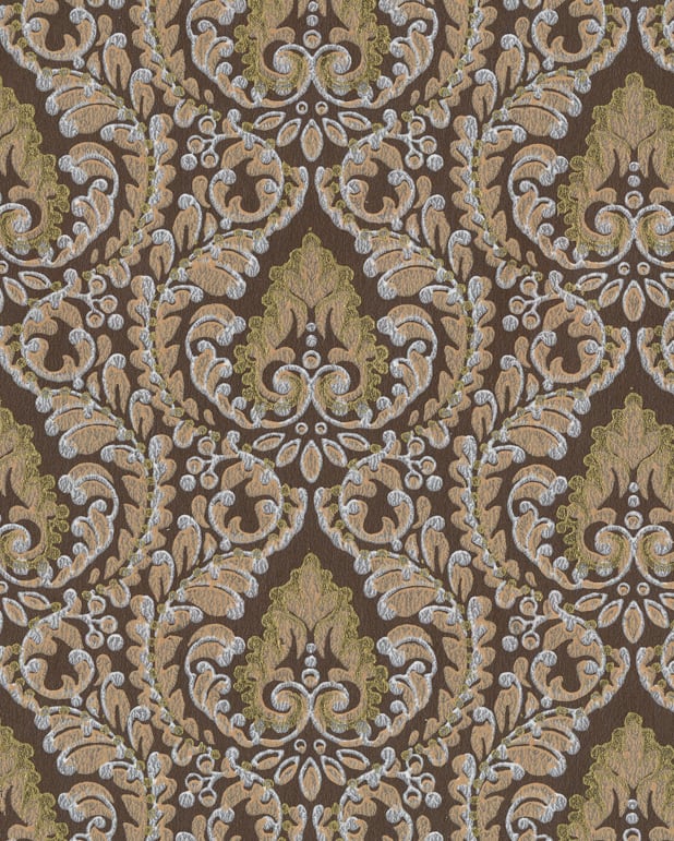 Läckra små medaljonger uppbyggda av bladrankor i färger från matt brun till skimrande brons. Tapet från Borås tapetfabrik i Borosan-serien.