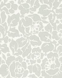 Det täta mönstret av blommor och blad är sannolikt hämtat från 1800-talets slut men här tryckt i 60-talets ljusa gråvita färger. Änden av rullarna har blivit svagt buckliga men vid applicering av klister slätas detta ut och resultatet på väggen är utmärkt slätt. (Tapetorama har prövat att sätta upp dem.)