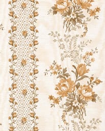 Trevliga små buketter med rosor och ängsblom i vertikala rader syns i denna 70-talstapet med närmast tidlös design. De vita fälten är tryckta med ett tunt knappt synbart mönster som ska likna vattrat siden.