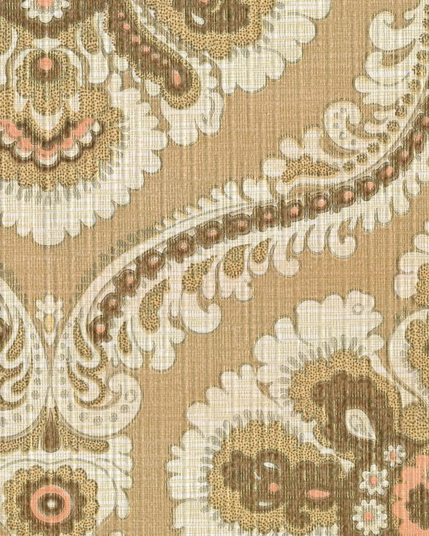 Textilimiterande tapet från nederländska Esta Behang i Enschede. Generösa medaljonger i guld, rosa, beige och brun, lätt glansig och med struktur. Fungerar bra till heltäckningsmatta, utsvängda byxor, sköna solglajjor och en tandpetare vilande i munnen. Två olika tryckningar 3+1 rulle.