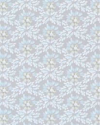 Ett tätt mönster som med sin koncentration håller tillbaka de diagonala rörelserna som finns i botten. Det ljusblå har en ovanligt pigg lyster. Viss skevhet i trycket. Harmonitapet.