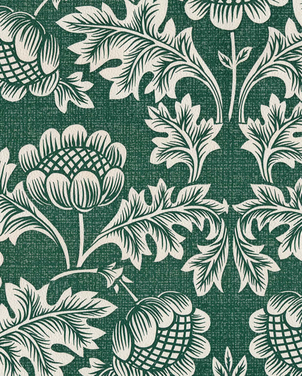 Försiktigt mönstrad botten ger bakgrunden till detta kraftfulla mönster i vilket blommorna är underställda en symmetri som balanseras fint av flyhänt teckning och individuellt utformade blad.