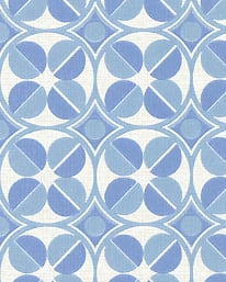 Tjusig tapet med rundlar i cirklar och mindre romber däremellan i tre vilsamma blå toner på vit botten. Originaltapet från 1970-talet.