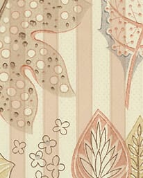 Denna tapet från tyska Hildesia-fabriken i Emmerke bei Hildesheim är rik i såväl uttryck som färgval. Växtligheten har på typiskt 50-talsmanér fjärmat sig långt från sina förlagor i naturen även om dess ursprung kan spåras. I bottenfärgen ligger ett prickmönster med pärlemorskimmer.