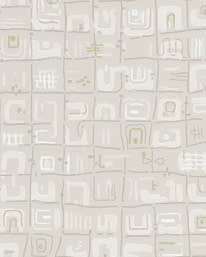 Klurigt mönster uppbyggt av svajande linjer och krumelurer. Notera det blekt mossgröna inslaget i färgställningen. Originaltapet, sannolikt från 50-talet.