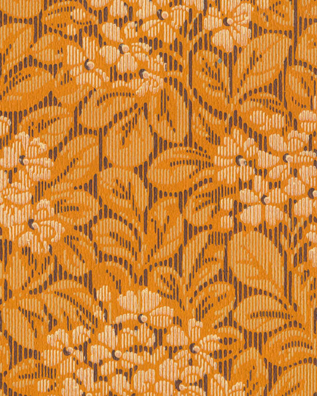 Gobelängimiterande mönster av denna typ, med ymnig växtlighet på randig eller rutig ofta mörk botten, var populärt under 1910-talet och en bit in på 20-talet. Här i en tapet från 1970-talet.