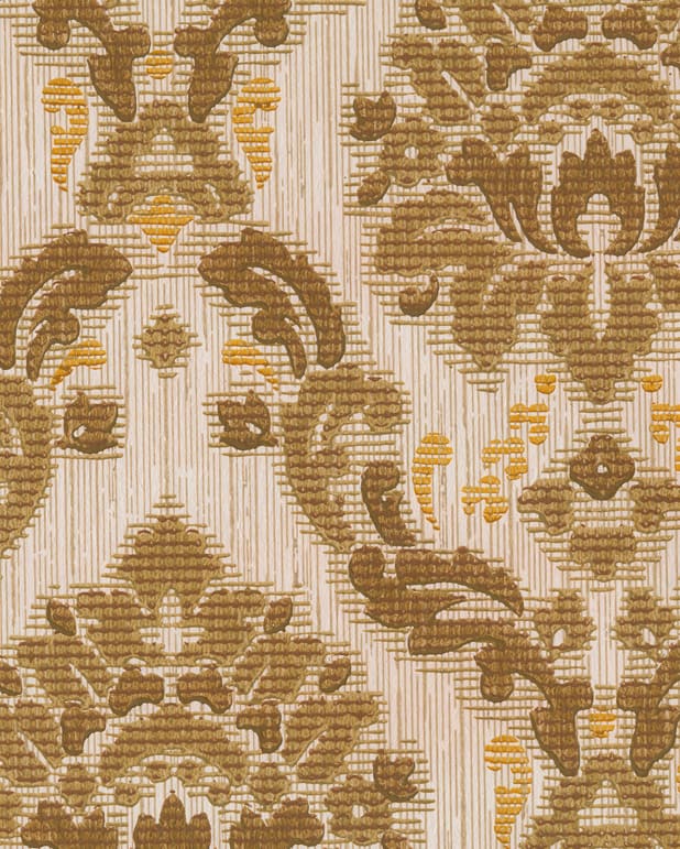 Definitionen av vardagslyx. En klassisk medaljongtapet från 70-talet från Kåbergs med ett fint randmönster i botten, som kontrasteras mot det tvärgående mönstret i figurerna – som därmed lyfts fram, så som det en gång var, då allt var tyg. Notera längden!