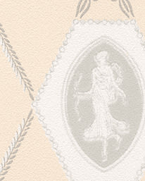 Klassicistisk och stram men ändå charmig med medaljonger och romber i grynigt utförande från Kalmar tapetfabrik. Originaltapet från 1950-talet eller möjligen 1940-tal. Observera att det är en så kallad dubbelrulle som är 12 meter lång i stället för 6,5 meter som var standard vid denna tid. En gammal retrotapet i stor stil.