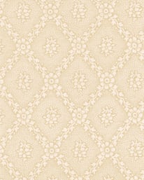 Näpna romber i mindre skala uppbyggd av präglade blommor och blad. Noterbar är den minutiösa präglingen runt blommorna inuti romberna: som skalsand. Bottenfärgen kan diskuteras. Grå, beige, med ett stick av laxrosa. Tapeten kan vara från 50-talet, kanske till och med 40-tal.
