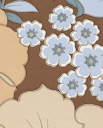 Blommor och blad som har mer eller mindre avlägsna förebilder i naturen. Färgskalan är inte så lite tidstypisk. Tapeten är förklistrad men sätts lämpligen upp med klister som vanligt.