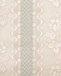 Vertikala fält med små buketter är avdelade av skuggade band med spaljé-ornament i denna distinkt präglade rikt mönstrade sak från Norrköpings tapetfabrik. Vem köpte den? Var satt den? Skriv till oss och berätta! Originaltapet från 60-talet, kanske.