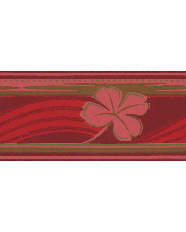 Som så ofta i gamla tapeter kombineras färger på ett sätt som man idag finner omöjligt, men det funkar, det är snyggt! Här är två gröna färger så främmande för varandra som en giraff och en musmatta, den ena giftig och artificiell, den andra murrigt brun, som växtfärgad. Lägg därtill det genomfärgade rosa pappret och vågmönstrets drakblodsröda nyans. Detta är en originaltapet från 10-talet, gissar vi, men kanske tidigare. Höjd: 4,5 cm. Minimibeställning 5 meter.
