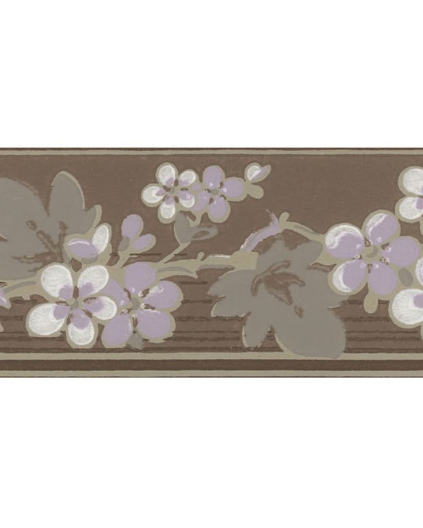 Söt bård som ändå gör anspråk på att tas på allvar. Kombinationen av matt brun, utsparade detaljer i beige och friskt gredelin går inte av för hackor. Originaltapet från 20-talet. Höjd: 7,5 cm. Minimibeställning 5 meter.
