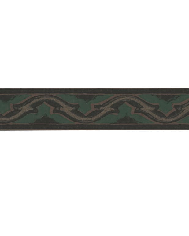 Silverbeströdd slinga med utskott, som en ringlande kvist, på dämpat grå-grön-marinblå botten. Originalbård från 20-talet. Höjd: 3 cm. Minimibeställning 5 meter.