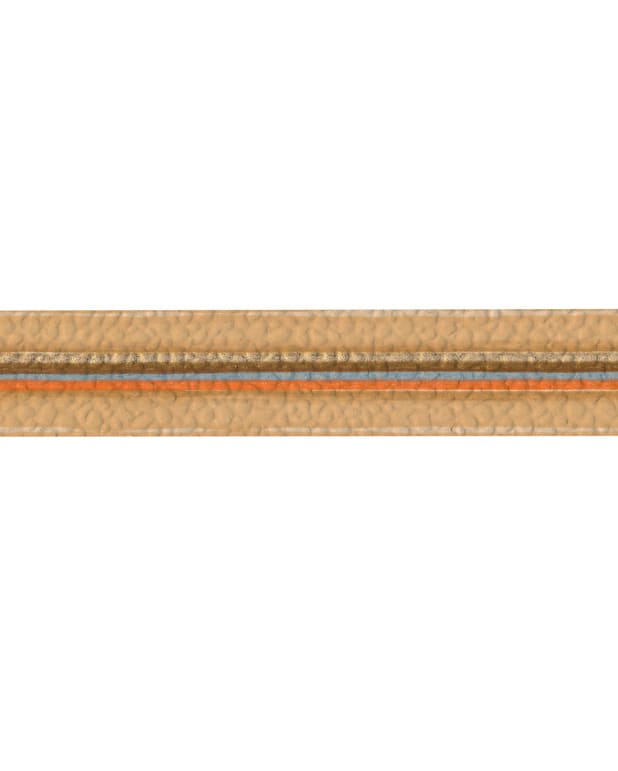 En ganska drastisk men inte ovanlig färgkombo från tiden i fråga – turkosblå, orange, brun och guld – tryckt på präglat putsimiterande papper. Det enkla randmönstret är faktiskt mycket effektfullt som en avgränsare mellan fält. Originalbård från 30-talet. Höjd: 2,5 cm. Minimibeställning 5 meter.