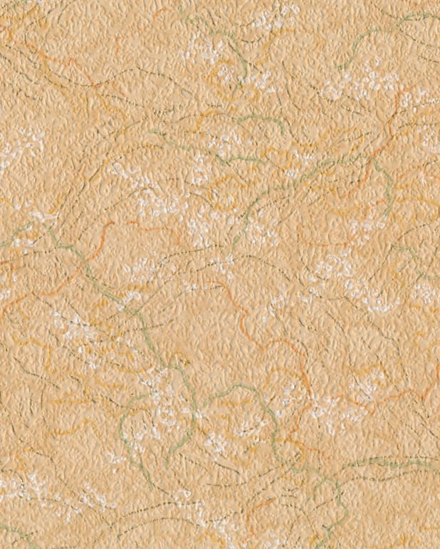 Grynig fin prägling och streck som ådringar i rätt pigga färger är grunden för denna 30-talstapet, med guldstänk. Tre kapade rullar.