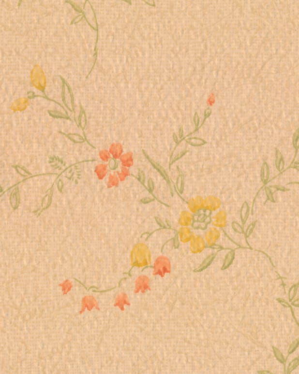Söta enkelt tecknade blommor på grynigt präglad botten. Möjligen från Göteborgs tapetfabrik.
