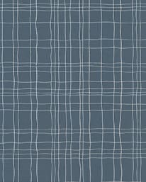 Tidstypisk design med handritade linjer i ett abstrakt mönster mot en lika typisk blå botten. På väggen är den alldeles strålande snygg. Tjugofem hela och två kapade rullar. Originaltapet från 1950-talet.