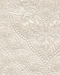 Pampigt och präglat tapetmönster med mandorlaformade medaljonger kring en heraldisk lilja och omgivna av vinrankeslingor. Originaltapet från 1950-talet.