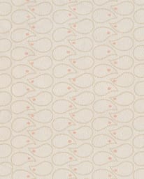 Ett lekfullt och tidstypiskt mönster bestående av liggande droppformer med varsin liten röd prick, som ett öga. Svensk 50-talstapet av okänt ursprung – en borttappad och glömd pärla. 2 hela och 4 kapade rullar.