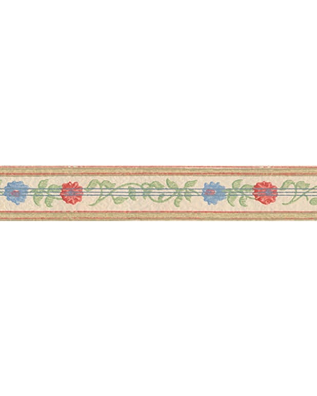 Ett par blommor av enklare slag utkastade och upprepade, sammanbundna med bladslingor och de tre fortlöpande tunna strecken. Finns i en annan färgställning; hör av er till butiken vid intresse! Originalbård från 50-talet, eller kanske något äldre. Höjd: 2,4 cm. Minimibeställning 5 meter.