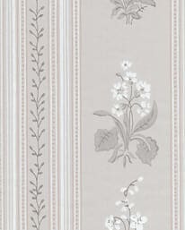 Näpna små blomsterarrangemang och ränder av olika slag – och så den typiskt grå med den typiskt rödrosa. Otypiskt är ett väldigt finstilt horisontellt vågmönster vars bieffekt är ett knappt skönjbart vertikalt randmönster. En gångbar tapet från slutet av 40- till början av 60-talet.