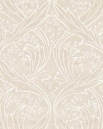 Vackert slingrande distinkt präglade flikiga blad som på ett förtjusande sätt kombineras med uppåtväxande småblommor och subtila variationer i bottenmönstret. Mönstret för tankarna till sent 1800-tal och arts and craft-estetik, men färgställningen och präglingen tillhör en helt annan epok.