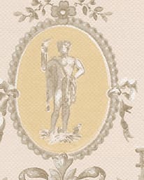 Medaljongtapet från Norrköpings tapetfabrik med bladverk, knutna band och grönska underställda en harmonisk helhet.