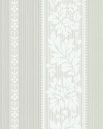 Typisk tapet från 50- eller 60-tal i vilken ränder kombineras med enklare vertikala mönster som för tankar till allmogevävar, men i modernt grått, och ofta med något försiktigt tillskott av färg. Troligtvis från Göteborgs tapetfabrik.