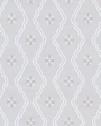 50-talstapet som inte gör väsen av sig men som tål att tittas på. Antydda romber och diagonala linjer gör det tämligen enkla mönstret expansivt. Rosa prickar!