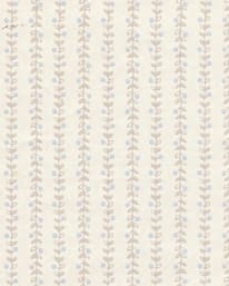 Charmerande trådsmala rankor av enkelt tecknade blad med blå prickar som markerar blommor. Varannan ranka går uppåt, varannan nedåt. Detta är en originaltapet från 50-talet.