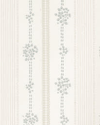 Randig modest tapet med ett charmfullt vertikalt tema där blomrankor stiliserats till ett asymmetriskt prickmönster som förtätas i återkommande klungor.