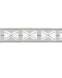 En fin, något udda, bård med ojämnt tryck som skapar liv och individualitet åt de rosettliknande elementen. Några skador på rullen. Originalbård från 50-talet. Höjd: 3,2 cm – eller mer beroende hur man skär den, det finns på rullen ett par ytterligare ljusgrå ränder kring det centrala motivet. Minimibeställning 5 meter.