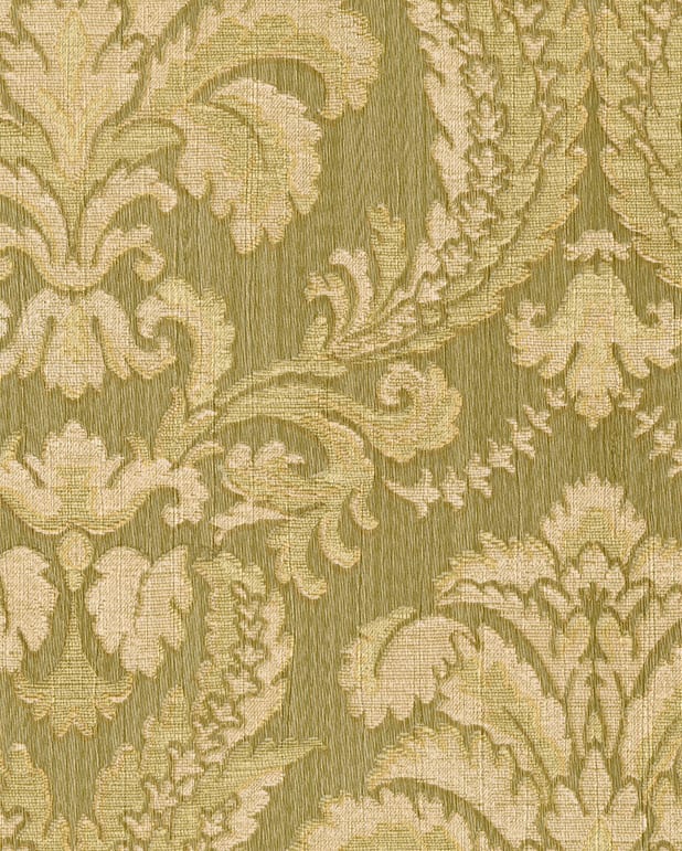 Fin textilimitation i vinyl, troligen italiensk, med plymaktigt bladverk inuti den granatäppleformade medaljongen. Märkt "Redialux".