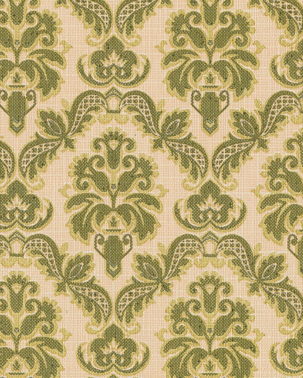 Vinyltapet från finska Sandudd med småskaliga medaljonger och svagt skimrande botten.