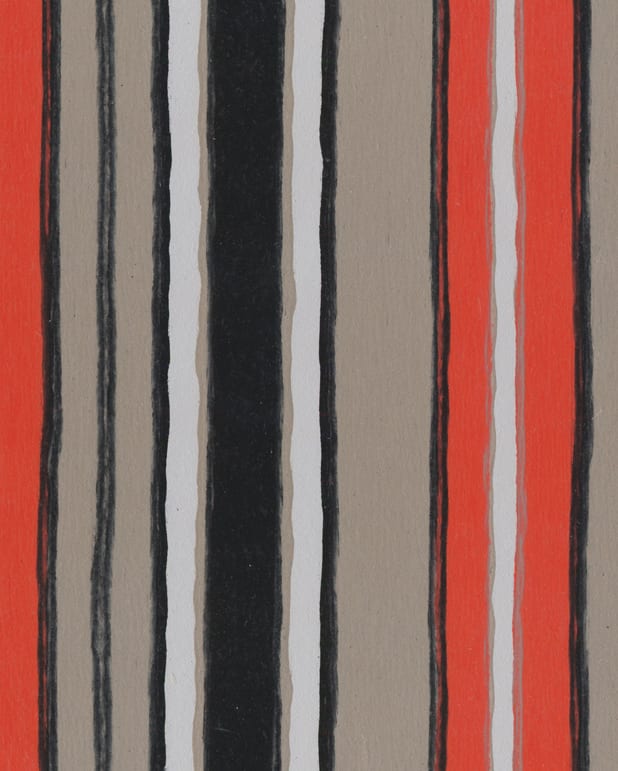 Slående kvalitet, ett svagt glimmer och fylligast tänkbara tryck. Vi har inga uppgifter om vare sig tid eller plats för denna tapets tillkomst, men vi gissar franskt och 50-tal. Ränderna är ojämna i utförande, och i vissa fall också i trycket, vilket ger en flytande övergång som kontrasterar mot de knalliga färgerna. Märkt "Tapetkompaniet Kvalité och stil". Kapade rullar, från 8 meter.